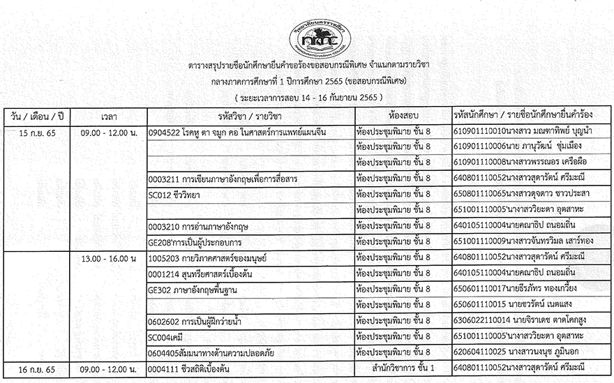 หัวข้อ : ประกาศ รายชื่อตารางสอบนักศึกษาที่มีสิทธิ์สอบกลางภาคกรณีพิเศษ ภาคการศึกษาที่ 1/2565 ระหว่างวันที่ 15-16 กันยายน 2565